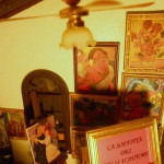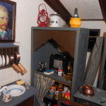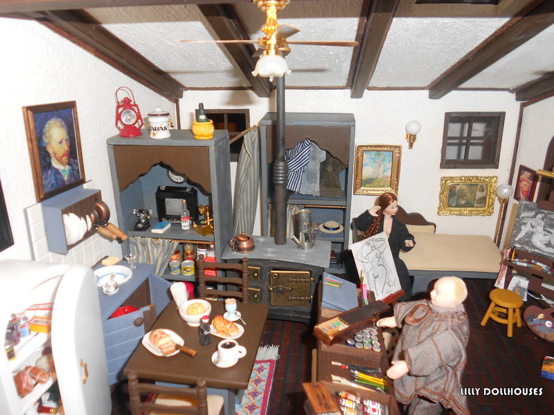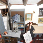 E’ interamente realizzata a mano e esteriormente è rivestita con mattoncini a faccia vista. Ho voluto rappresentare un grande locale adibito a abitazione/laboratorio, composto da un angolo di cottura, soggiorno con zona notte e bagno (seminascosto dietro la tenda scorrevole). Il pavimento è fatto di listelli di legno singoli, dipinti e verniciati; il tappeto sotto il tavolo è stato realizzato a punto croce; tutti i mobili sono tagliati a mano e poi assemblati; entrambi i personaggi indossano vestiti cuciti su misura e i quadri sono dei veri falsi d’autore, sono infatti stampati su tessuto e sorretti da cavalletti da pittore fatti a mano proprio come i pennelli e i tubetti di colore. Tutta l’ambientazione è dotata di un impianto di illuminazione funzionante a 12 volt.